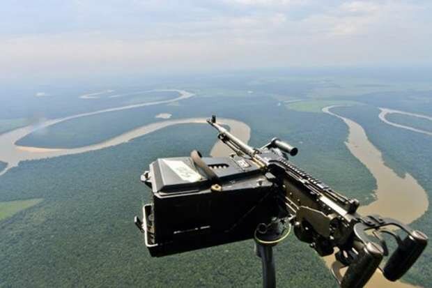Soldados colombianos asaltan una mina de oro ilegal en la reserva natural de Puinawal, en el Departamento de Guainía, en el transcurso de la Operación Anostomus. Las actividades mineras ilegales tienen lugar sobre todo en áreas de conservación ambiental como páramos, ríos y bosques, y producen la contaminación de los ecosistemas, la pérdida de los hábitats de los animales y el desplazamiento de comunidades nativas.