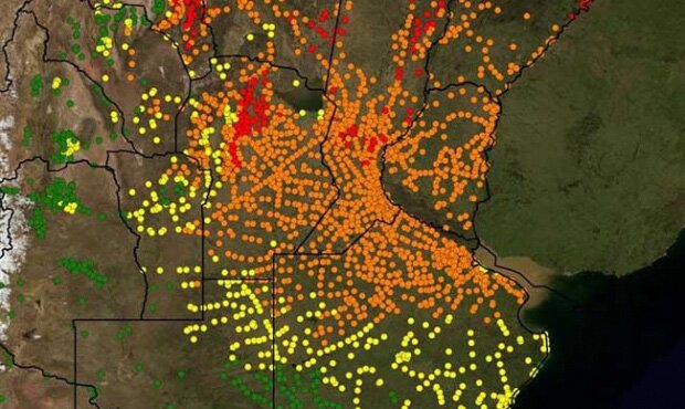 El color rojo que tiñe concentraciones urbanas del norte de Argentina advierte de las regiones con mayor probabilidad de contraer dengue. A la cabeza, la provincia de Misiones, fronteriza con Paraguay y Brasil y donde ya se registraron más de 3.500 casos, entre ellos uno fatal, de un anciano de 94 años con complicaciones previas de salud.